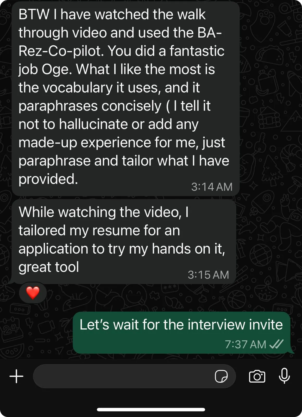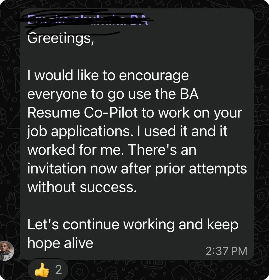 I would like to encourage everyone to go use the BA Resume Co-Pilot to work on your job applications. I used it and it worked for me. There's an invitation now after prior attempts without success. Let's continue working and keep hope alive