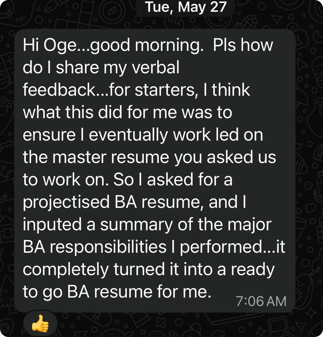 I think what this did for me was to ensure I eventually work led on the master resume you asked us to work on. So I asked for a projectised BA resume, and I inputed a summary of the major BA responsibilities I performed...it completely turned it into a ready to go BA resume for me.