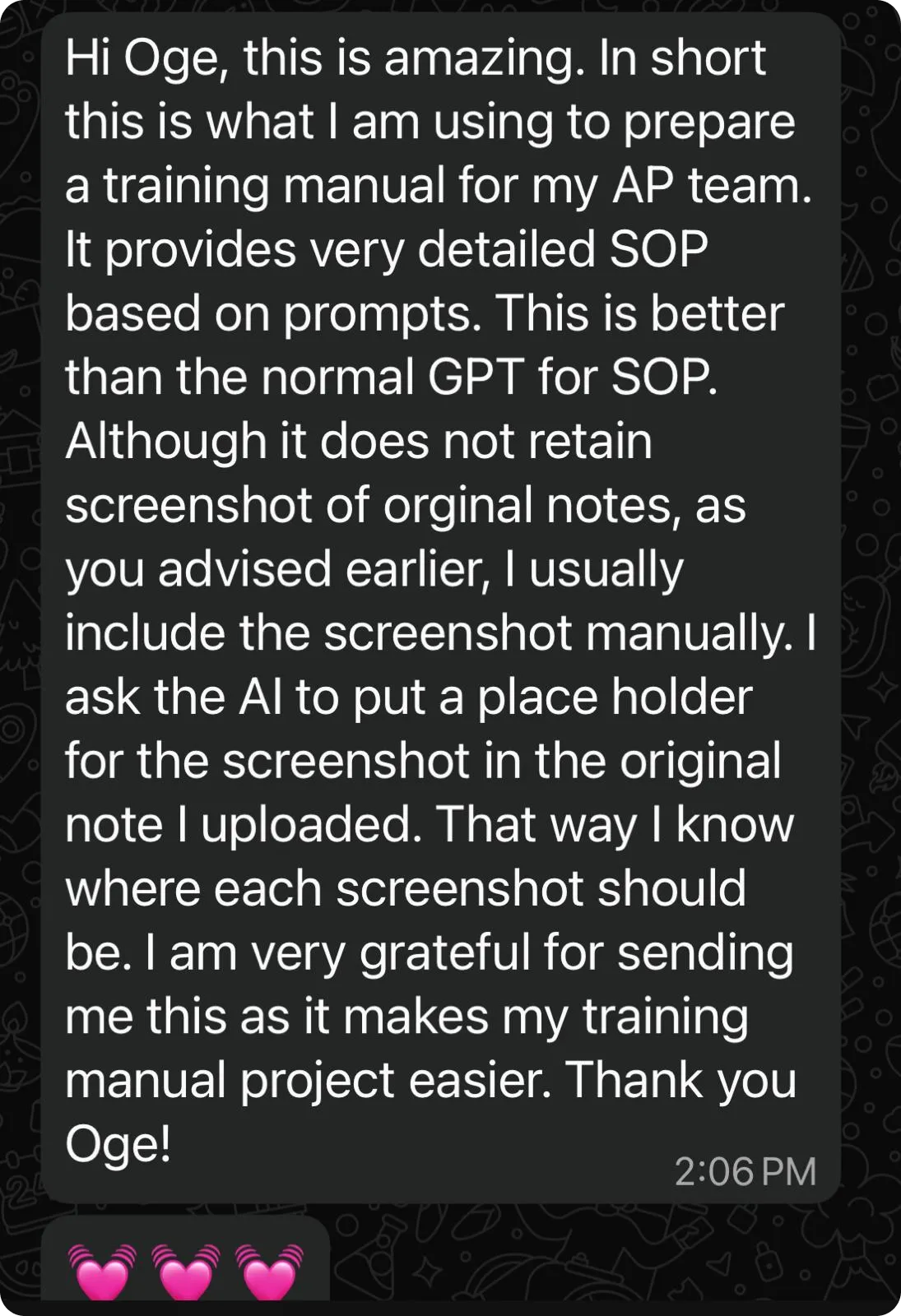This is amazing. In short this is what I am using to prepare a training manual for my AP team. It provides very detailed SOP based on prompts. This is better than the normal GPT for SOP. Although it does not retain screenshot of orginal notes, as you advised earlier, I usually include the screenshot manually. I ask the Al to put a place holder for the screenshot in the original note I uploaded. That way I know where each screenshot should be. I am very grateful for sending me this as it makes my training manual project easier. Thank you Oge!